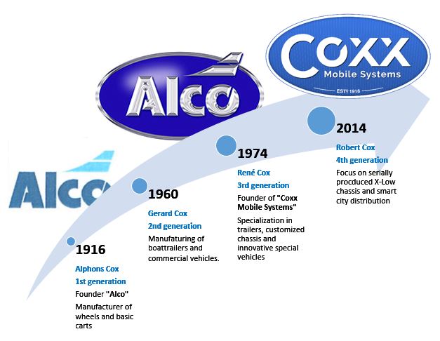 Coxx Mobile Systems, formerly known as “Alco” was founded in 1916 by Alphons Cox (Al-Co). Alphons started with the manufacturing of wheels, followed by simple farmers carts. Right from the start the company has been a pioneer in technology and innovations. Since the 1930s, Alco was producing complete vehicles and various types of trailers on a larger scale.